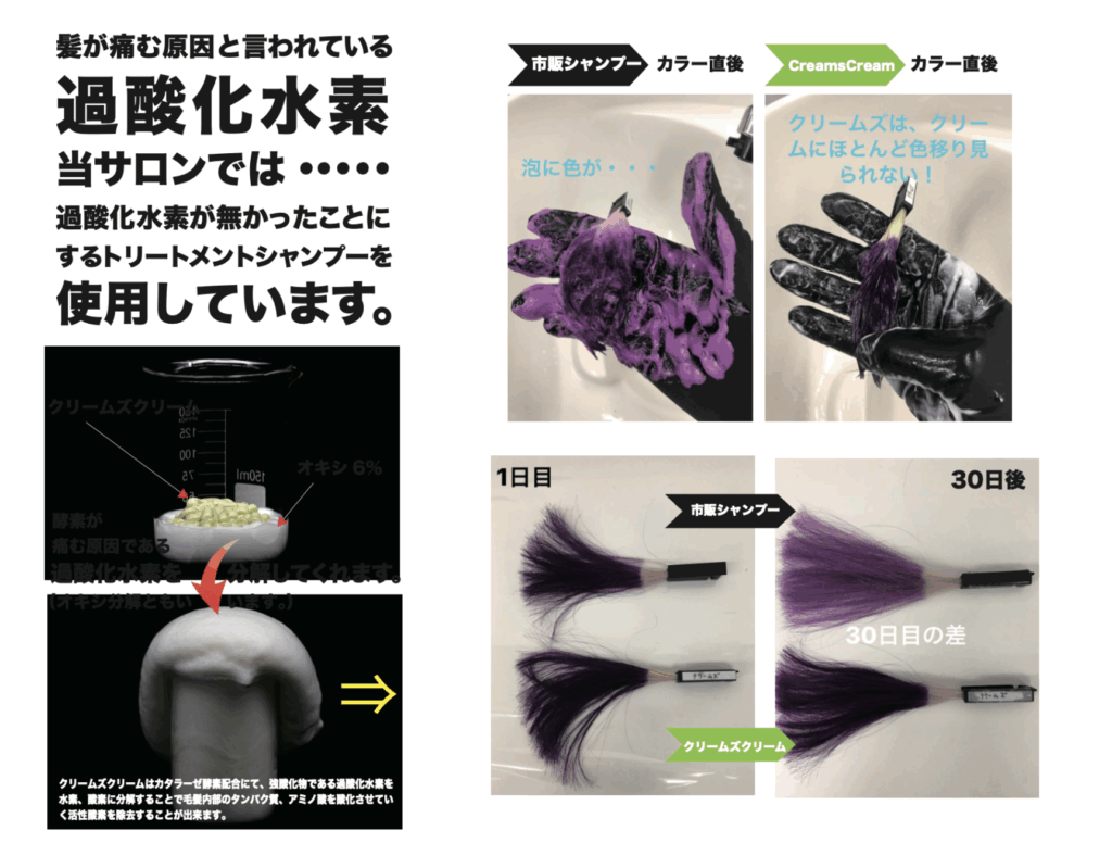 カラー剤の過酸化水素を水と酸素に酵素の力で分解する製品を自宅にて簡単にシャンプー&トリートメントとして使えることがお客様の付加価値だと思うのです・・