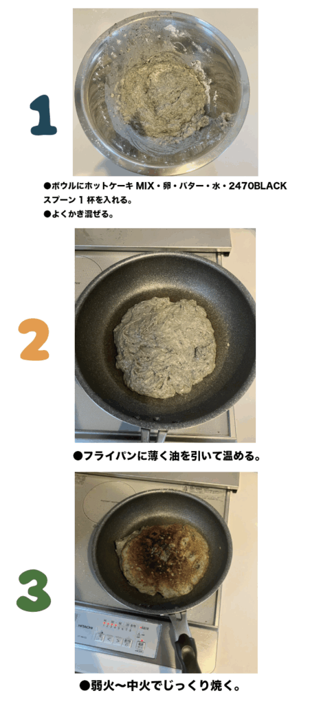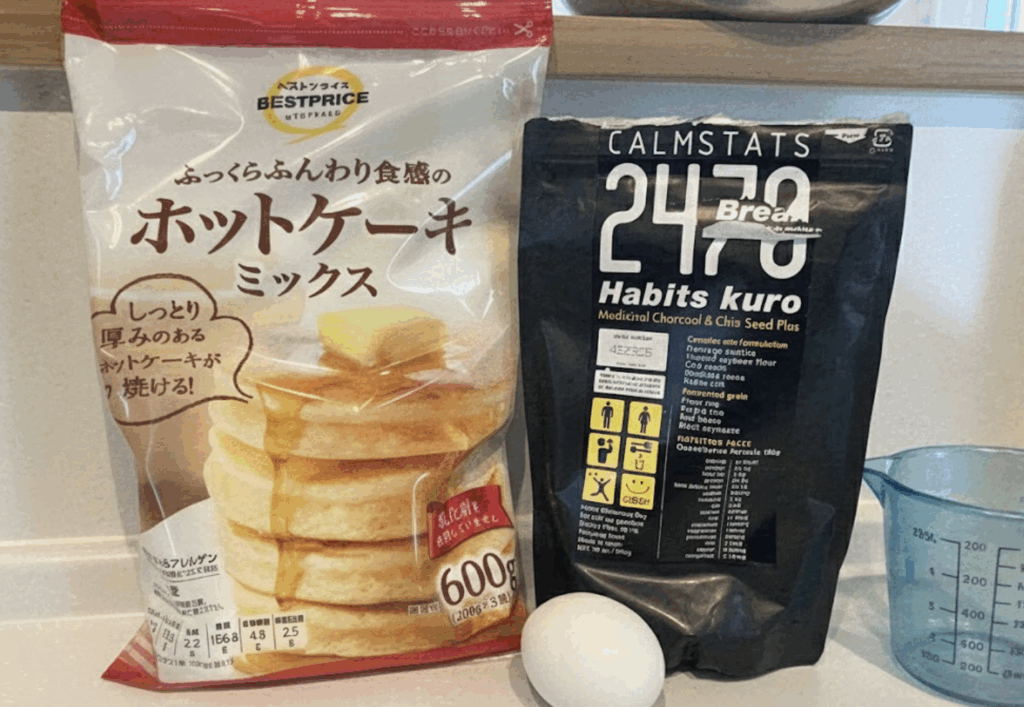 ホットケーキミックスの袋に書いてある分量に2470ハビッツを入れて混ぜて焼くだけ!