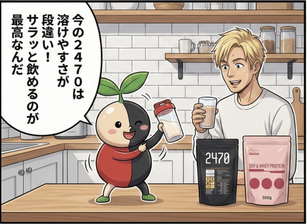 そうそう!パウダータイプになった2470はすっごく混ざりやすくなって、飲みやすくなって、硫黄の香りもあまりしないって言われる。シェーカーで混ぜのみ、オススメだよね!!